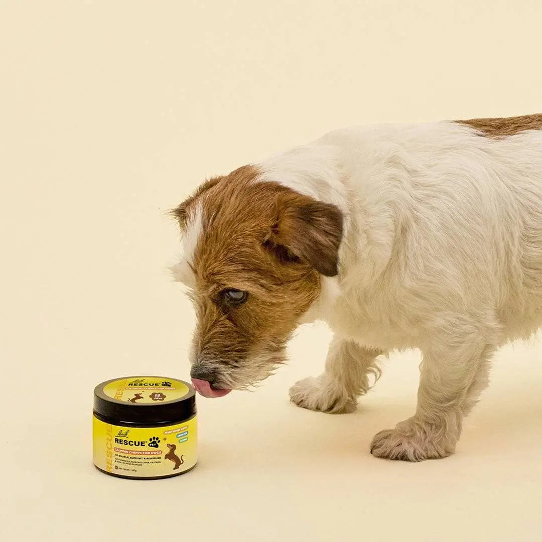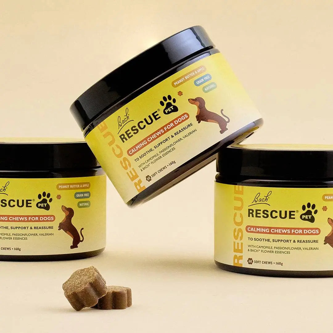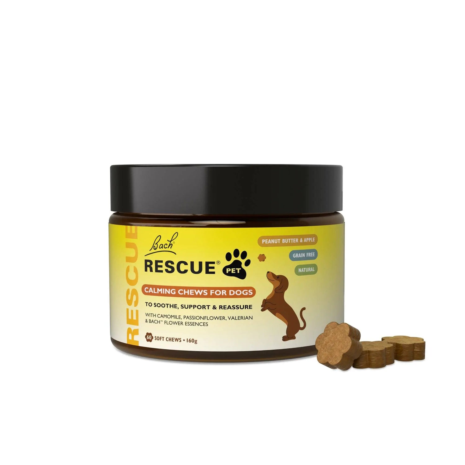 RESCUE® Pet Calming Chews for Dogs. Expertly crafted with a blend of botanicals including Camomile, Passionflower, Valerian, and Bach Original Flower Essences, to promote calmness and relaxation.